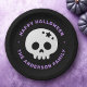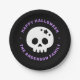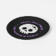 Chapas de papel redondas do Feliz Halloween com um crânio branco e bonito com estrelas. Ao redor do crânio estão textos personalizados em uma fonte arrojada, roxa, "Feliz Dia das Bruxas" e seu nome. Fundo preto. Todas as cores são personalizáveis.