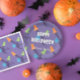 decoração de mesa de Halloween. Belo impressão de Halloween com um padrão perfeito. Design divertida com vários personagens em cores pastéis: morcegos, aranhas, abóboras, fantasmas... farão você morrer de amor! Veja todos os designs da coleção.