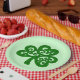Conjunto de oito placas de papel de 9" com uma imagem de um trevo branco de damasco em verde claro. Ver pote de doces correspondente, copo espresso, frasco, caneca, jarro, vidro alveolado, bule de chá e portas copos. Veja a Rua inteira. A coleção de pratos do dia de Patrick na COMIDA/BEV | Seção pratos.