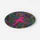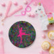 Design de dança pela paz com uma bailarina rosa quente no centro cercada por sinais de paz multicoloridos.