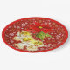 Dançando Anjos Bebês pendurados em uma flor de Poinsettia com ouro e flocos de neve brancos caindo sobre um fundo vermelho para fazer pratos de papel festivo.