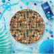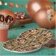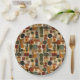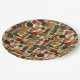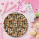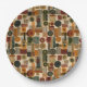 Sophisticated mid-century geometric pattern paper plate featuring layered circles, arches, triangles, and rectangles in forest green, burnt orange, ochre, and cream on a black background. Rich textures and retro-modern shapes create a bold design ideal for Bauhaus lovers, vintage décor fans, and anyone drawn to moody modern style.