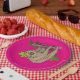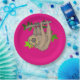 Um desenho bonito de uma preguiça-marrom agarrada a um galho com folhas, pendurada de cabeça para baixo. Fundo rosa quente.
