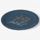 Chapas de papel no estilo rústico do outono em azul marinho com folhas marrons, guião branco creme "grata" Você pode facilmente personalizar sua própria frase. Bonita mesa de pratos de papel para o outono e o outono. Celebração de Ação de Graças.