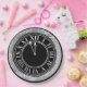 Esta glamourosa placa do partido personalizado apresenta um tema festivo de véspera de Ano Novo. Um relógio com o tempo quase à meia-noite é impresso em uma folha de prata falsa sobre fundo preto. A borda apresenta uma moldura de diamantes.