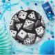 Este trabalho de arte digital dinâmico apresenta uma matriz de dados que tropeçam em um fundo preto intenso. Os dados variam de forma e tamanho, incluindo cubos tradicionais de seis lados e formas triangulares de quatro lados. Cada pastilha é meticulosamente detalhada, com contrastes agudos entre as superfícies brancas e os encanamentos pretos, criando um efeito visual impressionante. O arranjo caótico, porém harmonioso, dos dados evoca um senso de movimento e aleatoriedade, fazer a peça intrigante e lúdica.
