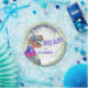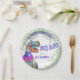 Cor d'água colorida Dinossauro T rex e folhagem da selva Jurássica Feliz Aniversário Placa de Papel Roar, ideal para festas de aniversario de meninas especialmente as celebrações temáticas da selva Jurássica. Vai perfeitamente com bolsas favoráveis. As palavras "A Happy Birthday Roar for" com um nome de criança. Moderna e divertida tipografia verde-escura e roxa que é fácil de personalizar usando a modelo. Arte original da artista Catherine Sweetman