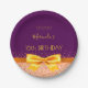 Uma placa de papel para uma giro e glamourosa 16ª festa de aniversário. Um fundo roxo feminino elegante com um confete rosa dourado falso. O texto: O nome é escrito com um script de estilo moderno, escrito à mão, de ouro. Modelo para nome, idade 16 e data.