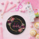 Um prato para uma doce 16ª festa de aniversário. Um fundo preto chic com uma falsa estrutura geométrica dourada. Decorados com flores roxas escuras e burgueiras, rosas e penas do estilo "boho". Modelos para um nome, 16 anos e uma data. Data de nascimento ou data da festa. O nome é escrito com um script de estilo manuscrito, letras cor-de-rosa, 16 anos em roxo e a data com números de ouro.