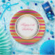 Chapas de papel de aniversário com um padrão elegante composto por listras horizontais metálicas cor-de-rosa, laranja e escura douradas. Um círculo branco com uma design de borda inclinada dourada colocada sobre o centro com o texto no meio.