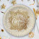 Feliz Natal em letras brancas em chic num esplash de folha de ouro falsa em um fundo de rabiscos e pontos de ouro modernos está nessas placas de papel personalizadas com seu nome. A combinar guardanapos e mais designs na nossa loja.