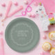 Perfeito para festas de noivado de jardim na primavera ou verão, este design elegante apresenta uma borda ondulada em um fundo verde sage poeirado. Personalize estes pratos de festa de noivado com o nome do seu evento, a data e o ano.