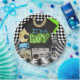 É um MENINO! FUN Retro anos 80 e Hip Hop Urban Vibe dos anos 90! apresenta traje preto de bebê com corrente Dourada de mosca em um fundo retro preto e branco com padrão de tabuleiro de xadrez. Grafite É um Texto para Meninos com Dourado Registro, Pager, Caixa de expansão para telefones de Sacudir, Pilha de Dinheiro e Bebês Bonitos. Cor azul, verde, preto e branco. ©2021 Designs do Partido Sassy