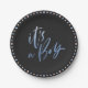 É um prato de papel decorativo de festa da "Boy Gender Reveal" com uma estrutura de pontos rosa e azul e uma caligrafia moderna. Visite o compro para ver toda a coleção!