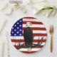 Uma águia careca varreu o céu de sua perca em um galho de árvore; sobreposto a uma bandeira dos Estados Unidos.