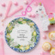 Projetada para coordenar com a Coleção de Limões de Jenny, esta placa de papel de chá de panela apresenta um limão amarelo e uma coroa floral branca. Há uma sugestão dos azulejos azuis à volta da borda do adesivo redondo. Ela Encontrou Seu aperto Principal começa o texto do chá de panela. O nome e o chá de panela da noiva seguem escritos em uma fonte moderna e moderna de script. A data completa o texto. Todo o texto é editável.