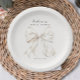 Design simples de prato de papel com laço branco para chá de panela de noiva.
