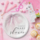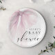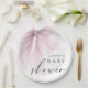Complete your sophisticated party theme with these elegant, personalized baby shower paper plates. The design features the collection's signature, ethereal watercolor bow in a pale pink hue, set against a white background. Easily customize the text with the mother's name, making it a perfect complement to your baby girl shower decor. These plates are an essential detail for a beautiful, cohesive table setting.