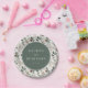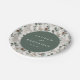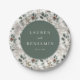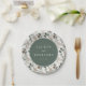 This elegant wedding plate features a vintage-inspired botanical design with a symmetrical layout, showcasing delicate leaves, berries, and pinecones in muted greens, browns, and beige tones. The central circular element is framed by an intricate floral pattern, creating a harmonious border around customizable text in a refined serif font. Perfect for formal occasions, the design exudes sophistication and tranquility, making it ideal for celebrating your special day with a touch of timeless elegance.