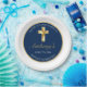 Diga obrigado a convidados, amigos e família com esta Elegante Dourada Primeira Comunhão, Obrigado Plate do Partido. Este design apresenta uma cruz ouro contra um simples fundo azul. Personalize a fonte e a cor e altere o texto e a data para atender às suas necessidades.