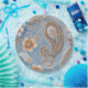 Uma ameixa suave e brilhante e floral de pêssego em placa de impressão azul em pó.