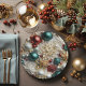 Pratos de papel de Natal com uma imagem de enfeites vermelhos, verdes e brancos, flores recortadas em papel, pérolas e contas adoráveis. Linda adição à sua mesa de Natal.