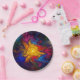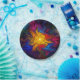 Um pouco psíquico, ondulado, girando, multicolorido, fractal, parecendo emissões eletromagnéticas emanadas do sol. A imagem é sobreposta a um fundo estrelado.