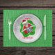 Esta placa de papel tem um esqueleto sorridente segurando ornamentos vermelhos e verdes com flocos de neve até seus olhos vestindo um chapéu de Papai Noel vermelho como forma dimensional ondulada em um fundo branco com círculos de vários tamanhos. Personalize o texto Feliz Natal com os modelos.