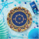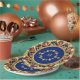 Ornamento de ouro com pedras vibrantes e um layout azul formal. Seu estilo decorativo medieval exemplifica elegância e design sofisticada, ideal para temas de luxo, antiguidade ou inspiração artística.