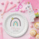 arco-íris e pratos de festa de aniversário roxos e rosados