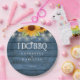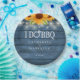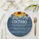 Luzes de corda bonitas e girassóis decoram os detalhes da celebração da sua festa de noivado especial em uma elegante tipografia em um fundo de madeira rústica azul. Projetado por Thisisnotme©