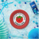 Tomate vermelho e suculento e engraçado com folhas verdes, pontos pretos para os olhos e um sorriso grande e aberto. Acima e abaixo dele em texto preto está o trocadilho que eu te amo de meus tomates de cabeça. O fundo é vermelho com um padrão de pequenas bolinhas brancas.