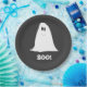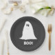 Arranja o teu canalha de Halloween com este prato de papel fantasma. Um fantasma sorridente está olhando para você e dizendo Boo! Design branco e preto clássico. Comprar como mostrado ou torne-o mais seu próprio adicionando quaisquer nomes ou palavras que tornem sua festa de Halloween especial.
