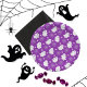 Fantasmas bonitos, aranhas e teias de aranha em um padrão roxo de Halloween.