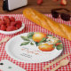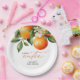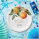 Little Cutie Orange Clementine Chá de fraldas Favor Paper Plates apresenta um belo buquê de laranjas aquáticas e flores junto com um elegante tipo de caligrafia.