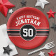 Vermelho, Branco e Negro - Esta camisa esportiva stripes design é perfeita para qualquer festa de aniversário masculina. Você muda os números para uma idade especial para uma celebração de aniversário. Um design robusto e masculino com uma área para um nome e uma idade.