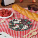 Estas placas de papel de Natal são perfeitas para amantes de gatos. Eles apresentam três gatinhos adoráveis vestindo chapéus de Papai Noel e brincando com ornamentos. O fundo é verde festivo com bagas vermelhas e sotaques de ouro. Estas placas de papel trarão um pouco de alegria e beleza para a sua mesa de Natal.