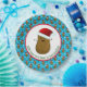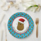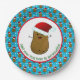 Uma batata de Natal marrom e giro vestindo um chapéu vermelho brilhante de Papai Noel com um cesto branco e uma pompom branco e fofo. Ele tem um rosto sorridente e se agarra pelos braços. Abaixo dele, em letras verdes, está uma modelo para adicionar sua própria mensagem ou texto para personalizar esses pratos de festas divertidas. A jante exterior das placas é um padrão repetido da mesma batateira com fundo azul e flocos de neve brancos cintilantes.