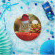 Este esquilo fofo vestido com um chapéu de Papai Noel espreita de trás de uma caixa de presente de Natal vermelha brilhante e um laço dourado para desejar “férias alegres” para a temporada.