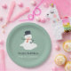 Pratos de papel personalizados Feliz Feriados com ilustração fofa de neve derretida. Projetada e ilustrada com amor por Kristine Lee Designs www.kristineleedesigns.com