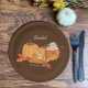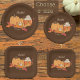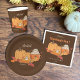 Bonito placas de papel castanho-escuro, com um casal de abóboras, uma caneca laranja, uma fatia de tarte e algumas folhas de outono. Personalize com o texto e o nome da família ou remova o texto. Procure na nossa coleção guardanapos de papel e copos de papel. © ArianeC Ilustrações — Todos os direitos reservados