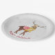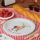 Grande cervo em flocos de neve com cachecol de inverno e texto Felizes Férias em vermelho sobre fundo de floco de neve prateado.