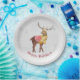 Grande cervo em flocos de neve com cachecol de inverno e texto vermelho Férias Felizes em fundo de floco de neve prateado.