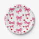 estes charmosos pratos de papel com um lindo padrão de laços cor-de-rosa e corações vermelhos. Ideais para aniversários, Dia dos Namorados, chá de noiva, chá de bebê ou qualquer celebração feminina. Uma maneira divertida e festiva de adicionar um toque lúdico à sua mesa de festa!