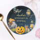 Placas de festa de aniversário mimadas e assustadoras do Halloween pratos personalizados de modelo, abóbora-das-bruxas, morcego, coruja, gato, criando pote estrelado à noite, fundo negro do céu.