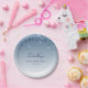 Estas placas de papel chic, elegantes, de festa de aniversário 90 apresentam uma borda brilhante azul esparsa e borda azul ombre e fundo azul. Personalize-os com o nome da convidada de honra em um guião azul de escrita manual, com seu aniversário e data abaixo na fonte sans serif.