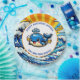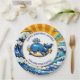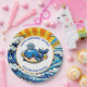 Festa de aniversário de menino com tema náutico ou marítimo em pratos de papel. Azul, baleias amarelas pop art. Adicione o nome da criança na área de personalização.