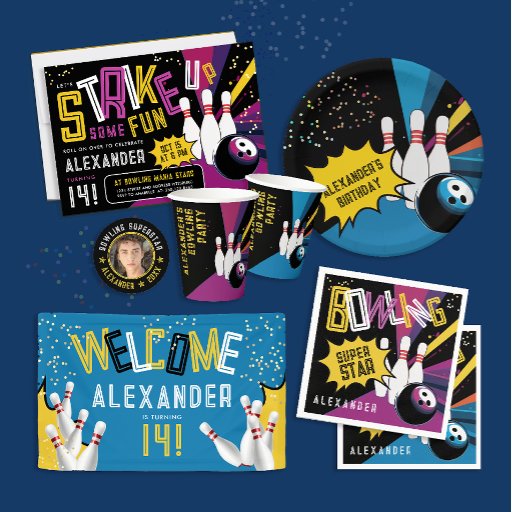 Pontuação grande com nossas legal e coloridas placas de aniversário de boliches com uma explosão de alegria e vibrante tipografia moderna. Com os elementos da boliche retrógrada contra um pano de fundo preto, eles colocaram o palco para uma celebração enérgica. Com fontes esportivas arrojadas e o nome escrito em uma bolha cômica, estas placas de papel são a escolha perfeita para a festa de aniversário do seu filho ou adolescente. Personalize-os com o seu próprio nome e prepare-se para atirar em alguns arcos e celebrar no estilo!
