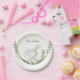 Complemente a decoração da festa de baby shower com esses pratos de papel fofos com ilustração de um coelho se divertindo em um balanço. Ótimo para baby showers e aniversários. Ilustrado e projetado por Patricia Alvarez.