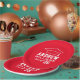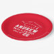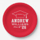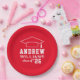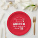 As placas de papel de graduação redonda personalizadas apresentam um design vermelho e branco (pode ser modificado via "Personalizar!") com um boné de formatura e texto personalizado para o nome do formando e o ano de classe.